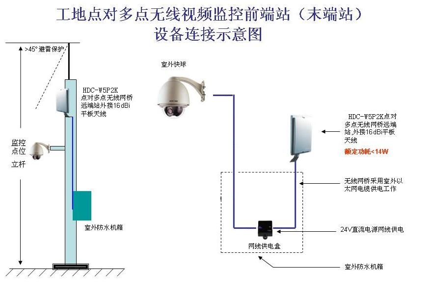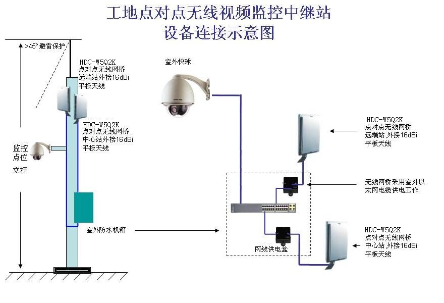 為保證某項(xiàng)目工程安全順利進(jìn)行,公司管理人員能夠及時了解施工現(xiàn)場情況和施工進(jìn)度,在工程現(xiàn)場安裝了合肥環(huán)宇智能工程有限公司的5.8GHz室外點(diǎn)對點(diǎn)、點(diǎn)對多點(diǎn)無線視頻監(jiān)控系統(tǒng),該系統(tǒng)由合肥監(jiān)控公司環(huán)宇智能的點(diǎn)對點(diǎn)、點(diǎn)對多點(diǎn)無線網(wǎng)橋和200W網(wǎng)絡(luò)高速球組成。