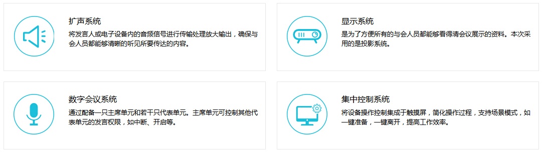 會議是日常工作環(huán)境中不可缺少的一個環(huán)境,本方案致力于解決會議系統(tǒng)的基本需求,但在滿足基本需求的條件下,提供可選配置,用于補充會議系統(tǒng)某些方面的需求。