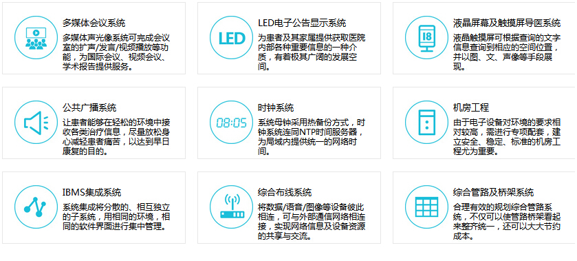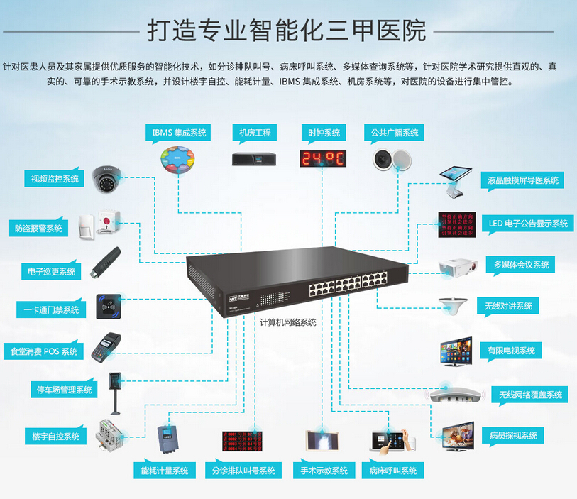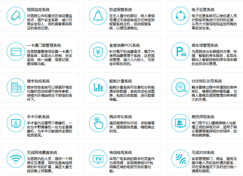 本解決方案包括:綜合布線系統(tǒng)、安全防護(hù)系統(tǒng)、網(wǎng)絡(luò)服務(wù)系統(tǒng)、出入人員探視安全管理和排隊(duì)呼叫、病房呼叫等系統(tǒng)組成。